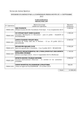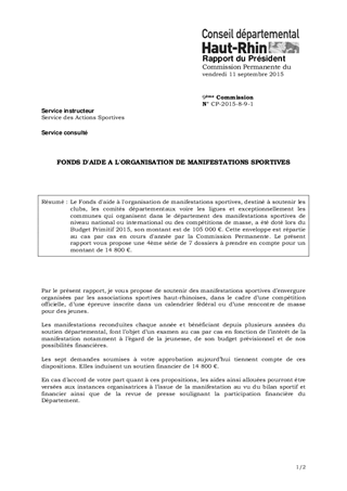 Le Fonds d'aide à l'organisation de manifestations sportives, destiné à soutenir les clubs, les comités départementaux voire les ligues et exceptionnellement les communes qui organisent dans le département des manifestations sportives de niveau national ou international ou des compétitions de masse, a été doté lors du Budget Primitif 2015, son montant est de 105 000 €. Cette enveloppe est répartie au cas par cas en cours d'année par la Commission Permanente. Le présent rapport vous propose une 4ème série de 7 dossiers à prendre en compte pour un montant de 14 800 €.