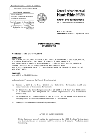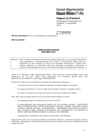 Dans le cadre des Interventions Economiques Générales, il est proposé d’accorder une subvention de fonctionnement de 4 000 € à Fond’Action Alsace pour la réalisation de ses missions en 2015 qui consistent notamment à repérer des projets originaux et innovants dans les domaines scientifique, économique, culturel et humanitaire et à mettre en lumière des talents remarquables d’Alsace.