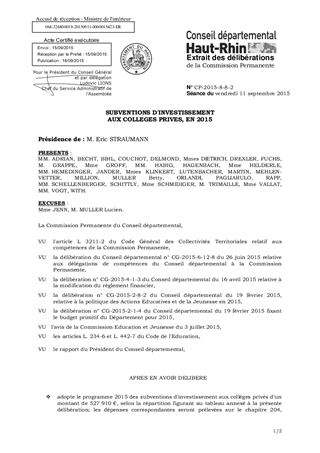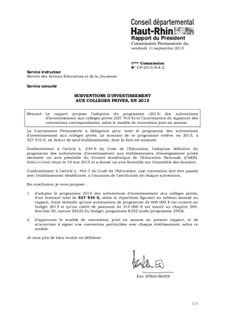 Le rapport propose l’adoption du programme «2015» des subventions d’investissement aux collèges privés (527 910 €) et l’autorisation de signature des conventions correspondantes, selon le modèle de convention joint en annexe.