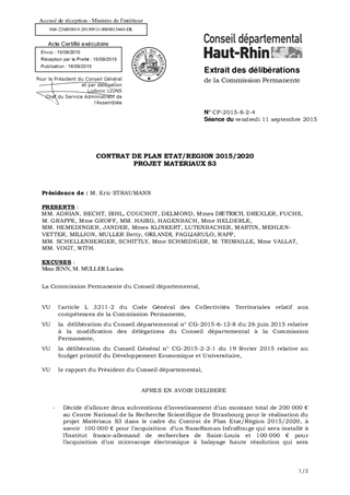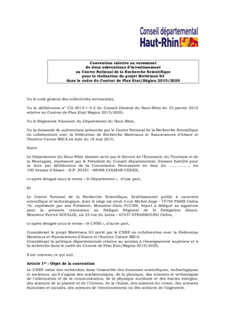 Dans le cadre du Contrat de Plan Etat/Région 2015/2020, il est proposé d’allouer deux subventions d’investissement d’un montant total de 200 000 € au Centre National de la Recherche Scientifique pour la réalisation du projet Matériaux S3, à savoir 100 000 € pour l’acquisition d’un NanoRaman InfraRouge installé à l’Institut franco-allemand de recherches de Saint-Louis et 100 000 € pour l’acquisition d’un microscope électronique à balayage haute résolution installé à l’Université de Haute-Alsace à Mulhouse. Il est également demandé d’approuver la convention de financement y afférente, précisant les modalités de versement des subventions départementales, et de m’autoriser à la signer. Le projet Matériaux S3 consiste à soutenir une recherche d’excellence dans le domaine des Matériaux et Nanosciences pour faire émerger les innovations de rupture de demain et les transformer en création d’emploi, de poursuivre le développement de plateformes techniques ouvertes aux partenaires académiques et industriels, de participer à la formation de qualité des ingénieurs de demain et de mener une démarche proactive envers les entreprises pour les accompagner dans leurs projets de recherche et développement (R&D) et d’expertise.