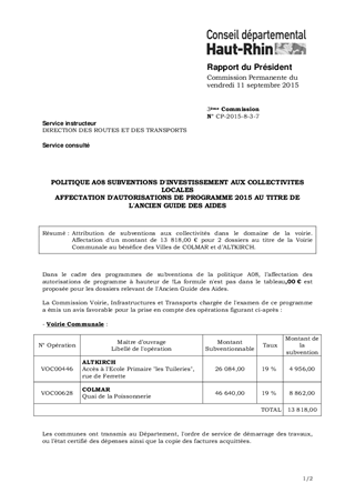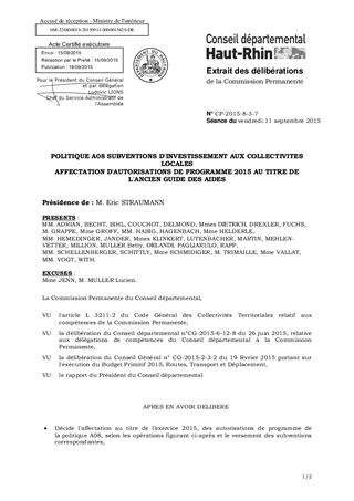 POLITIQUE A08 SUBVENTIONS D'INVESTISSEMENT AUX COLLECTIVITES LOCALES AFFECTATION D'AUTORISATIONS DE PROGRAMME 2015 AU TITRE DE L'ANCIEN GUIDE DES AIDES