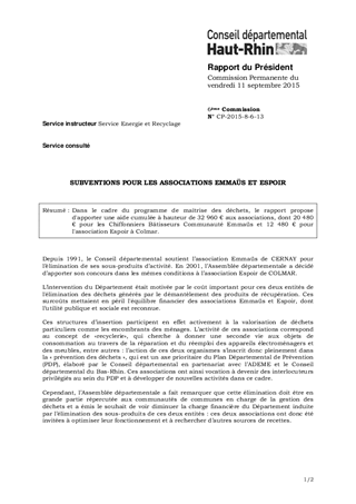 Dans le cadre du programme de maîtrise des déchets, le rapport propose d'apporter une aide cumulée à hauteur de 32 960 € aux associations, dont 20 480 € pour les Chiffonniers Bâtisseurs Communauté Emmaüs et 12 480 € pour l'association Espoir à Colmar.