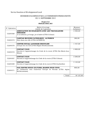 Dans le cadre de la mise en œuvre de la politique départementale d'insertion, ce rapport a pour objet de proposer l'attribution d'aides financières pour permettre le développement de projets locaux d'insertion validés par les Commissions Territoriales des Solidarités Actives (CTSA) d’Altkirch, de Colmar, de Guebwiller, de la région Mulhousienne et de Ribeauvillé/Sainte-Marie-aux Mines pour un montant total de 18 127 €.