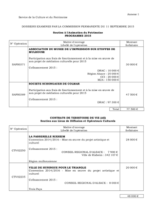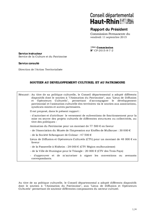 Au titre de sa politique culturelle, le Conseil départemental a adopté différents dispositifs dont le soutien à "l'Animation du Patrimoine", aux "Lieux de Diffusion et Opérateurs Culturels", permettant d'accompagner le développement patrimonial et l'animation culturelle des territoires via le soutien aux associations, syndicats mixtes et autres partenaires. Il est proposé, dans le présent rapport : - d'autoriser et d'attribuer le versement de subventions de fonctionnement pour la mise en œuvre des projets culturels de différentes structures ou collectivités, au titre des politiques : Animation du Patrimoine pour un montant de 77 500 € en faveur - de l'Association du Musée de l'Impression sur Etoffes de Mulhouse : 30 000 € - de la Société Schongauer de Colmar : 47 500 € Lieux de Diffusion et Opérateurs Culturels (CTV) pour un montant de 48 000 € en faveur - de la Passerelle à Rixheim : 28 000 € (CTV Région mulhousienne) - de la Ville de Huningue pour le Triangle : 20 000 € (CTV des Trois Pays) - d'approuver et de m'autoriser à signer les conventions ou avenants correspondants.