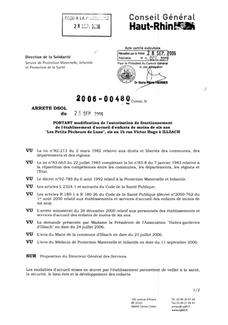 portant modification de l'autorisation de fonctionnement de l'établissement d'accueil d'enfants de moins de six ans "Les Petits Pêcheurs de Lune", sis au 1b rue Victor Hugo à ILLZACH. Resumé Pièces jointes ARRETE Assemblée : Non défini Date : 25/09/2006 Rapporteur : Non défini Collectivité : Conseil départemental du Haut-Rhin Direction : Non défini Service : Service de Protection Maternelle et Infantile Domaine : Accueil d'enfants Commission :