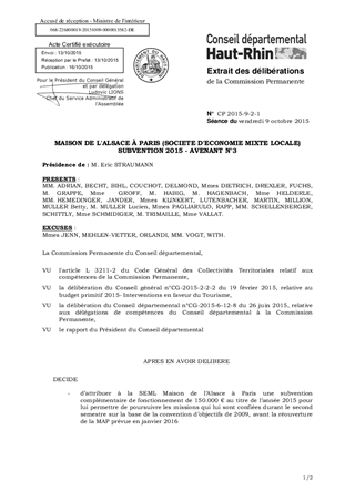 MAISON DE L'ALSACE À PARIS (SOCIETE D'ECONOMIE MIXTE LOCALE) SUBVENTION 2015 - AVENANT N°3
