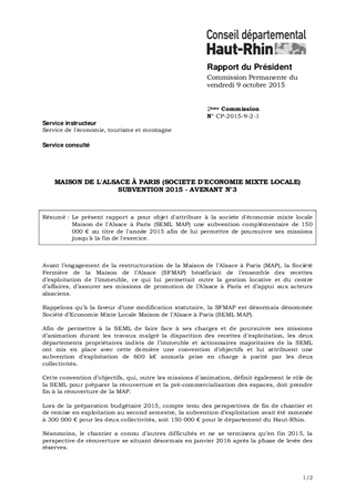 Le présent rapport a pour objet d'attribuer à la societe d'économie mixte locale Maison de l'Alsace à Paris (SEML MAP) une subvention complémentaire de 150 000 € au titre de l'année 2015 afin de lui permettre de poursuivre ses missions jusqu'à la fin de l'exercice.