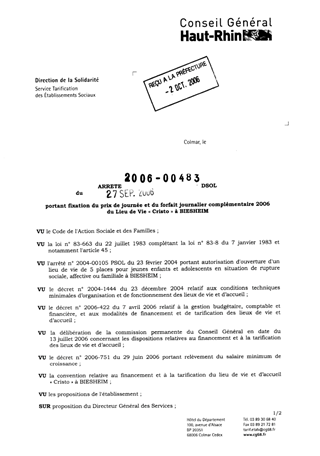 portant fixation du prix de journée et du forfait journalier complémentaire 2006 du lieu de vie "Cristo" à BIESHEIM. Resumé Pièces jointes ARRETE Assemblée : Non défini Date : 27/09/2006 Rapporteur : Non défini Collectivité : Conseil départemental du Haut-Rhin Direction : Non défini Service : Service de la Tarification des Etablissements Domaine : Prix de Journée Commission :