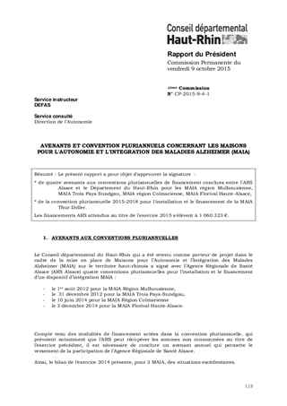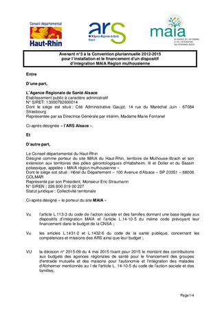 Le présent rapport a pour objet d'approuver la signature : * de quatre avenants aux conventions pluriannuelles de financement conclues entre l'ARS Alsace et le Département du Haut-Rhin pour les MAIA région Mulhousienne, MAIA Trois Pays Sundgau, MAIA région Colmarienne, MAIA Florival Haute-Alsace, * de la convention pluriannuelle 2015-2018 pour l'installation et le financement de la MAIA Thur Doller. Les financements ARS attendus au titre de l'exercice 2015 s'élèvent à 1 060 323 €.
