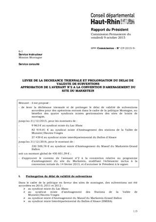 il est proposé : - de lever la déchéance triennale et de prolonger le délai de validité de subventions accordées pour des opérations entrant dans le cadre de la politique Montagne, au bénéfice des quatre syndicats mixtes gestionnaires des sites de loisirs de montagne, jusqu’au 31/12/2015, pour les montants de : - 9 963 € au syndicat mixte du Lac Blanc - 82 919,81 € au syndicat mixte d’Aménagement des stations de la Vallée de Munster/Hautes-Vosges - 27 459 € au syndicat mixte interdépartemental du Ballon d’Alsace jusqu’au 31/12/2016, pour le montant de : - 330 509,78 € au syndicat mixte d’Aménagement du Massif du Markstein-Grand Ballon soit un montant global de 450 851,59 € ; - d'approuver le contenu de l'avenant n°2 à la convention relative au programme d'aménagement du site du Markstein, modifiant l'échéancier inclus à la convention initiale du 14 février 2013, et d'autoriser le Président à le signer.