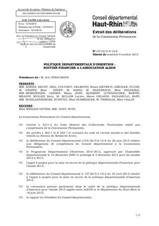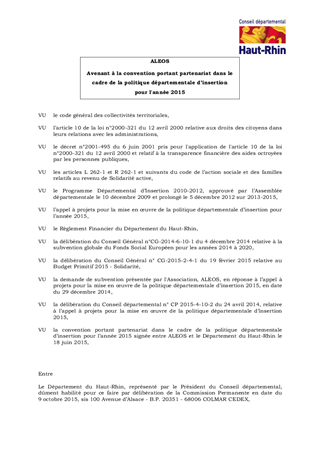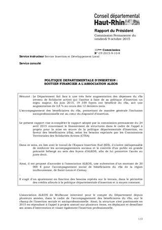 Le Département fait face à une très forte augmentation des dépenses du rSa (revenu de Solidarité active) qui l’amène à faire de sa politique d’insertion un enjeu majeur. En juin 2015, 19 359 foyers ont bénéficié du rSa, soit une augmentation de 3,8 % au cours des 12 derniers mois. L’accompagnement des bénéficiaires du rSa, permettant de manière générale l’inclusion socioprofessionnelle est au cœur du dispositif d’insertion. Le présent rapport vise à compléter le rapport adopté par la commission permanente du 24 avril 2015 concernant le financement de structures dans le cadre de l’appel à projets pour la mise en œuvre de la politique départementale d’insertion, en faveur des bénéficiaires (rSa), selon les besoins exprimés par les Commissions Territoriales des Solidarités Actives (CTSA) Dans ce sens, en lien avec le travail de l’Espace Insertion Sud (EIS), il s’avère indispensable de renforcer les accompagnements sociaux et le contrôle d’un public en grande précarité hébergé au sein des foyers d’ALEOS, afin de lui permettre l’accès au juste droit. Ainsi, il est proposé d’accorder à l’association ALEOS, une subvention d’un montant de 20 000 € pour l’accompagnement social de bénéficiaires du rSa de la région mulhousienne, de Saint-Louis et Cernay. Il s'agit d'un ajustement en fonction des besoins repérés sur le terrain, dans le périmètre des crédits alloués à la politique départementale d'insertion et à moyen constant.