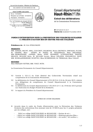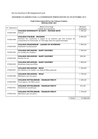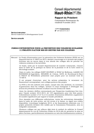 Le Fonds d'Intervention pour la prévention des Violences Scolaires (FIVS) est un dispositif doté de 31 000 € en 2015, destiné à encourager et à soutenir des projets d'actions mis en œuvre dans et aux abords des collèges afin de prévenir les violences scolaires et les incivilités. Ce fonds, initié par le Conseil départemental de manière volontariste, s’inscrit dans le cadre de sa politique en faveur de la jeunesse et de la lutte contre le décrochage scolaire. Dans ce cadre, les collèges SAINT EXUPERY et WOLF de Mulhouse, LAZARE DE SCHWENDI de Ingersheim, MOLIERE de Colmar, KATZ de Burnhaupt-le-Haut et PEGUY de Wittelsheim présentent onze projets pour un montant total de 15 820 €. Il est proposé d'autoriser, pour les actions présentées, le versement du financement correspondant, aux collèges porteurs des projets. Le FIVS a été très sollicité cette année, compte tenu des incidents, en constante augmentation dans les collèges, incitant le corps enseignant à développer des actions de prévention diverses touchant tous les niveaux de classe. Ainsi, les derniers chiffres communiqués par l’Inspection Académique font état, pour l’année scolaire 2014-2015, de 155 signalements pour des faits graves. L’absentéisme scolaire (+4,5 %) et le nombre d'exclusions définitives augmentent de manière significative par rapport à l’année précédente. Pour répondre aux différentes sollicitations, toutes les subventions demandées dans le cadre de cette action, ont été revues à la baisse, eu égard aux crédits disponibles. L'enveloppe budgétaire 2015, si les financements inhérents aux 11 projets présentés devaient être validés par la Commission Permanente, sera en intégralité consommée. Plusieurs collèges ont par ailleurs déjà émis le souhait de solliciter le Conseil départemental en vue de l’obtention d’aides en 2016 afin de permettre la mise en place d’actions, particulièrement nécessaires au sein des établissements scolaires.