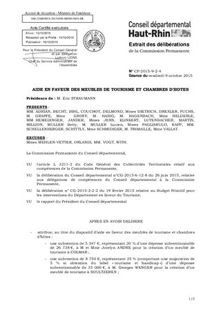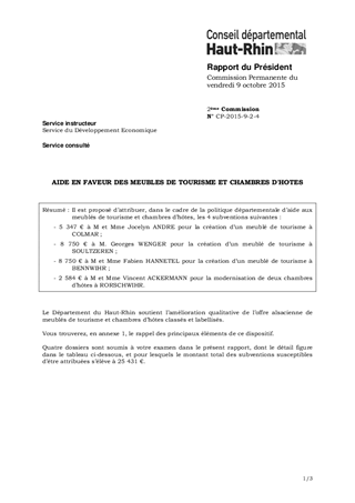 Il est proposé d’attribuer, dans le cadre de la politique départementale d’aide aux meublés de tourisme et chambres d’hôtes, les 4 subventions suivantes : - 5 347 € à M et Mme Jocelyn ANDRE pour la création d’un meublé de tourisme à COLMAR ; - 8 750 € à M. Georges WENGER pour la création d’un meublé de tourisme à SOULTZEREN ; - 8 750 € à M et Mme Fabien HANNETEL pour la création d’un meublé de tourisme à BENNWIHR ; - 2 584 € à M et Mme Vincent ACKERMANN pour la modernisation de deux chambres d’hôtes à RORSCHWIHR.