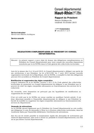 Le présent rapport a pour objet de donner des délégations complémentaires au Président du Conseil départemental pour tenir compte des nouvelles dispositions introduites par la loi NOTRe dans le Code général des collectivités territoriales.