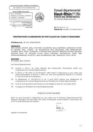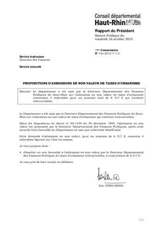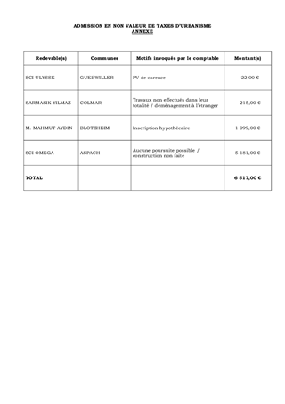 Le Département a été saisi par le Directeur Départemental des Finances Publiques du Haut-Rhin sur l’admission en non valeur de taxes d’urbanisme concernant 4 redevables pour un montant total de 6 517 € qui s’avèrent irrécouvrables.