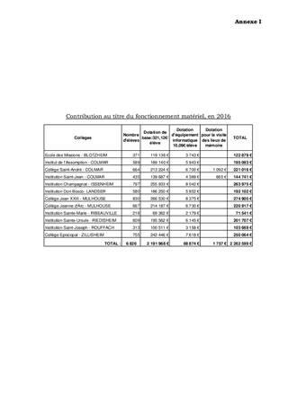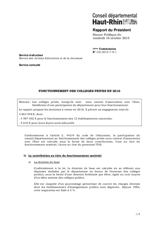 Les collèges privés, lorsqu'ils sont sous contrat d'association avec l'Etat, bénéficient d'une participation du département pour leur fonctionnement. Le rapport propose les dotations à verser en 2016. Il prévoit un engagement total de 4 603 548 €, dont: . 4 597 932 € pour le fonctionnement des 12 établissements concernés, . 5 616 € pour leurs foyers socio-éducatifs.