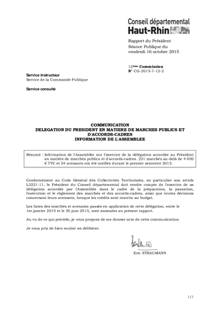Information de l'Assemblée sur l'exercice de la délégation accordée au Président en matière de marchés publics et d'accords-cadres. 231 marchés au-delà de 4 000 € TTC et 54 avenants ont été notifiés durant le premier semestre 2015.