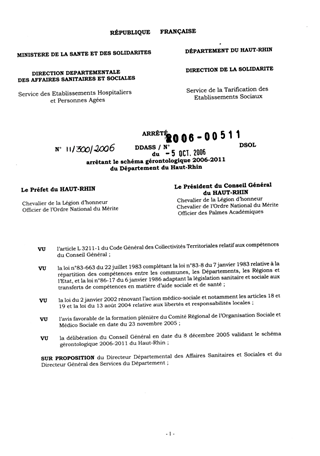 arrêtant le schéma gérontologique 2006-2011 du Département du Haut-Rhin. Resumé Pièces jointes ARRETE Assemblée : Non défini Date : 05/10/2006 Rapporteur : Non défini Collectivité : Conseil départemental du Haut-Rhin Direction : Non défini Service : Service de la Tarification des Etablissements Domaine : Autres (non classés) Commission :