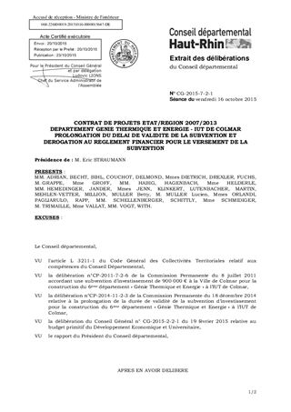 CONTRAT DE PROJETS ETAT/REGION 2007/2013 DEPARTEMENT GENIE THERMIQUE ET ENERGIE - IUT DE COLMAR PROLONGATION DU DELAI DE VALIDITE DE LA SUBVENTION ET DEROGATION AU REGLEMENT FINANCIER POUR LE VERSEMENT DE LA SUBVENTION