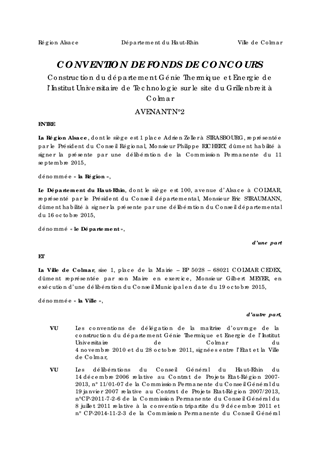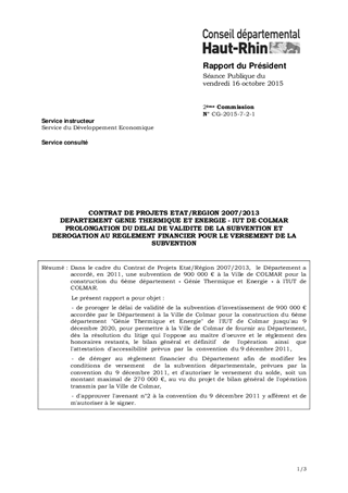 Dans le cadre du Contrat de Projets Etat/Région 2007/2013, le Département a accordé, en 2011, une subvention de 900 000 € à la Ville de COLMAR pour la construction du 6ème département « Génie Thermique et Energie » à l’IUT de COLMAR. Le présent rapport a pour objet : - de proroger le délai de validité de la subvention d'investissement de 900 000 € accordée par le Département à la Ville de Colmar pour la construction du 6ème département "Génie Thermique et Energie" de l'IUT de Colmar jusqu'au 9 décembre 2020, pour permettre à la Ville de Colmar de fournir au Département, dès la résolution du litige qui l'oppose au maître d'oeuvre et le règlement des honoraires restants, le bilan général et définitif de l'opération ainsi que l'attestation d'accessibilité prévus par la convention du 9 décembre 2011, - de déroger au règlement financier du Département afin de modifier les conditions de versement de la subvention départementale, prévues par la convention du 9 décembre 2011, et d'autoriser le versement du solde, soit un montant maximal de 270 000 €, au vu du projet de bilan général de l'opération transmis par la Ville de Colmar, - d'approuver l'avenant n°2 à la convention du 9 décembre 2011 y afférent et de m'autoriser à le signer.