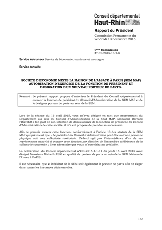 SOCIETE D'ECONOMIE MIXTE LA MAISON DE L'ALSACE À PARIS (SEM MAP) AUTORISATION D'EXERCICE DE LA FONCTION DE PRESIDENT ET DESIGNATION D'UN NOUVEAU PORTEUR DE PARTS.