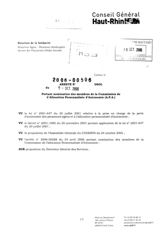 portant nomination des membres de la Commission de l'Allocation Personnalisée d'Autonomie (A.P.A.) Resumé Pièces jointes ARRETE Assemblée : Non défini Date : 09/10/2006 Rapporteur : Non défini Collectivité : Conseil départemental du Haut-Rhin Direction : Non défini Service : Cellule Centrale du Service Social Domaine : Autres (non classés) Commission :