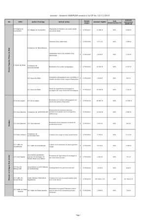 Dans le cadre de la démarche GERPLAN, le Département est sollicité pour 24 opérations dont le coût total s’élève à 79 105,61 € : - plantation d’arbres / création de vergers à BUHL, MUNCHHOUSE, GUEVENATTEN, PETIT-LANDAU, - animations spécifiques autour des fruitiers et des haies à BOURBACH-LE-HAUT, sur le territoire des communautés de communes de la Vallée de Saint-Amarin, de la Vallée de la Doller et du Soultzbach, de la Porte du Sundgau et d’Essor du Rhin, - mise en place de prairies fleuries à MUNCHHOUSE et sur la communauté de communes de Porte de France Rhin Sud, - aménagement d'un parcours sensoriel à BEBLENHEIM, - étude de requalification écologique et paysagère des zones d’activités économiques de la communauté de communes Essor du Rhin, - développement de la biodiversité dans les entreprises de la zone d’activités de VIEUX-THANN, - réalisation de sentiers pédagogiques à BLODELSHEIM et sur la communauté de communes de la Largue, - restauration d’une zone humide à KOETZINGUE et renaturation de plusieurs talus à LEVONCOURT, - collecte et recyclage de pneus agricoles usagés sur le territoire de la communauté de communes de la Vallée de Hundsbach, - promotion de l'agriculture à MASEVAUX, dans le Val d’Argent, le Jura alsacien ainsi que sur le territoire de la communauté de communes de Thann-Cernay, - accompagnement de communes dans leur projet d’installation et de pérennisation d’exploitations agricoles sur le territoire de Mulhouse Alsace Agglomération, - création à SIGOLSHEIM d'un local de transformation de produits agricoles pour l’EARL Clarisse SIBLER.