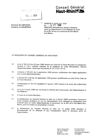 portant déclassement dans le domaine privé du Département d'un délaissé au droit de la RD 48 sur la commune de SAINTE MARIE AUX MINES. Resumé Pièces jointes ARRETE Assemblée : Non défini Date : 09/10/2006 Rapporteur : Non défini Collectivité : Conseil départemental du Haut-Rhin Direction : Non défini Service : Service du Patrimoine et du droit des Sols Domaine : Déclassement de voirie Commission :