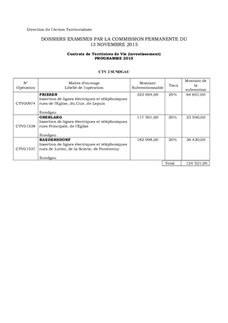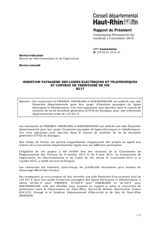 Les communes de FRIESEN, OBERLARG et RAEDERSDORF ont sollicité une aide financière départementale pour leur projet d’insertion paysagère de lignes électriques et téléphoniques. Ces trois opérations sont inscrites dans le contrat de territoire de vie de deuxième génération (CTV2) du Sundgau, pour une subvention départementale totale de 124 521 €.