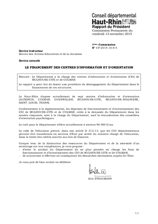 Le Département a la charge des centres d'information et d'orientation (CIO) de MULHOUSE-CITE et de COLMAR. Le rapport a pour but de lancer une procédure de désengagement du Département dans le financement de ces structures.