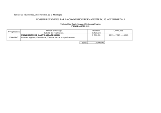 Dans le cadre de la convention de partenariat du 27 avril 2015, il est proposé d’allouer une subvention de fonctionnement de 3 500 € à l’Université de Haute-Alsace pour le développement d’un pôle d’excellence régional à visibilité internationale « le Réseau Algèbre, Géométrie, Théorie de Lie et Applications ».