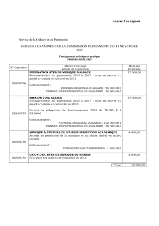Dans le cadre de la mise en œuvre du Schéma Départemental des Enseignements Artistiques 2013/2017, il est proposé, dans le présent rapport : - d'accorder des subventions de fonctionnement à 2 structures œuvrant pour la pratique musicale et vocale pour un montant total de 6 000 € et d'autoriser leurs versements ; - d'accorder des subventions de fonctionnement à 2 structures concourant à la mise en œuvre du Schéma Départemental des Enseignements Artistiques (SDEA) pour un montant total de 62 000 € et d'autoriser leurs versements, à raison de : . 35 000 € à Mission Voix Alsace (MVA) . 27 000 € à la Fédération des Sociétés de Musique d'Alsace (FSMA) - d'approuver et m'autoriser à signer la convention correspondante.