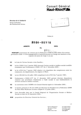 portant autorisation de création par la Fédération ADMR du Haut-Rhin d'un service prestataire d'aide et d'accompagnement à domicile prenant en charge des mineurs et des majeurs de moins de vingt et un ans. Resumé Pièces jointes ARRETE Assemblée : Non défini Date : 17/10/2006 Rapporteur : Non défini Collectivité : Conseil départemental du Haut-Rhin Direction : Non défini Service : Service de la Tarification des Etablissements Domaine : Autres (non classés) Commission :