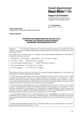 Il est proposé d’approuver la troisième programmation pour l’année 2015 des aides à attribuer aux projets structurants inscrits dans les Contrats de Territoire de Vie (CTV) 2014-2019. 16 projets sont concernés pour un montant total d’aides départementales de 2 240 283 € répartis de la façon suivante : - CTV Piémont – Val d’Argent – Pays Welche : 26 174 € pour 1 projet ; - CTV Thur – Doller : 680 804 € pour 7 projets ; - CTV de la Région Mulhousienne : 1 099 735 € pour 4 projets ; - CTV des Trois Pays : 311 400 € pour 1 projet ; - CTV du Sundgau : 122 170 € pour 3 projets. Par ailleurs, dans le cadre de ces aides, il vous est proposé d’approuver et d’autoriser le Président du Conseil départemental à signer : - la convention de partenariat entre les co-financeurs pour la mise en œuvre de la 3ème tranche de l’Opération Collective de Modernisation de l’Artisanat, du Commerce et des Services (OCM) du Sundgau, dont le projet est annexé au présent rapport. Dans ce cadre, deux aides départementales de 50 000 € et de 9 450 € sont programmées dans la liste des projets structurants du Contrat de Territoire de Vie du Sundgau. - la convention de partenariat entre les co-financeurs pour la mise en œuvre de la 2ème tranche de l’Opération Collective de Modernisation de l’Artisanat, du Commerce et des Services (OCM) de la Communauté de communes de THANN-CERNAY, dont le projet est annexé au présent rapport. L’aide départementale de 9 750 € est programmée dans la liste des projets structurants du Contrat de Territoire de Vie Thur-Doller. - la convention portant sur le fonctionnement de la médiathèque de bassin de vie de CERNAY, dont le projet est annexé au présent rapport. L’aide départementale de 40 695 € est programmée dans la liste des projets structurants du Contrat de Territoire de Vie Thur-Doller. 2 projets de développement local 2015 ( CTV Thur-Doller) sont concernés pour un montant total d’aides départementales de 18 138 €. Enfin, compte tenu de la situation particulière de la Communauté de Communes du Pays du Ried Brun qui va être dissoute à compter du 1er janvier 2016, il vous est proposé d’attribuer de manière anticipée une subvention pour le poste d’agent de développement pour l’année 2015 à hauteur de 18 984 €.