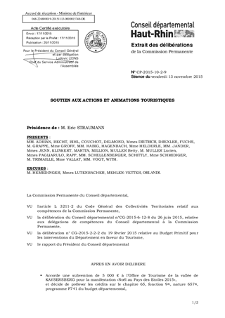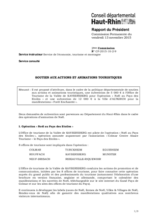 Il est proposé d’attribuer, dans le cadre de la politique départementale de soutien aux actions et animations touristiques, une subvention de 5 000 € à l’Office de Tourisme de la Vallée de KAYSERSBERG pour l’opération « Noël au Pays des Etoiles » et une subvention de 12 000 € à la Ville d’ALTKIRCH pour la manifestations « Forêt Enchantée ».