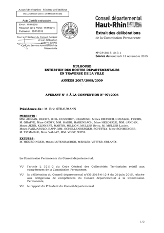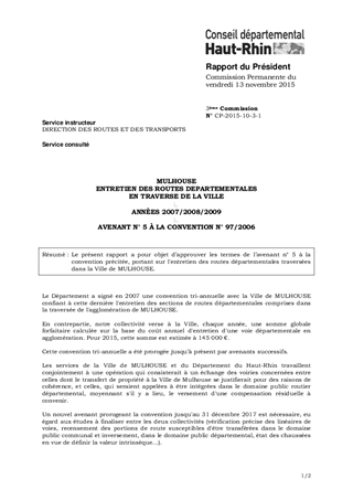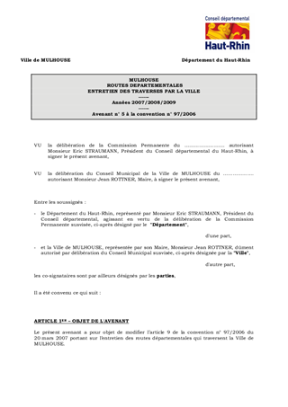 MULHOUSE ENTRETIEN DES ROUTES DEPARTEMENTALES EN TRAVERSE DE LA VILLE ANNÉES 2007/2008/2009 AVENANT N° 5 À LA CONVENTION N° 97/2006