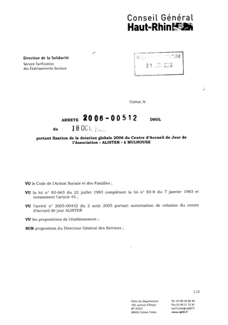 portant fixation de la dotation globale 2006 du centre d'accueil de jour de l'Association "Alister" à MULHOUSE. Resumé Pièces jointes ARRETE Assemblée : Non défini Date : 18/10/2006 Rapporteur : Non défini Collectivité : Conseil départemental du Haut-Rhin Direction : Non défini Service : Service de la Tarification des Etablissements Domaine : Dotations financières Commission :