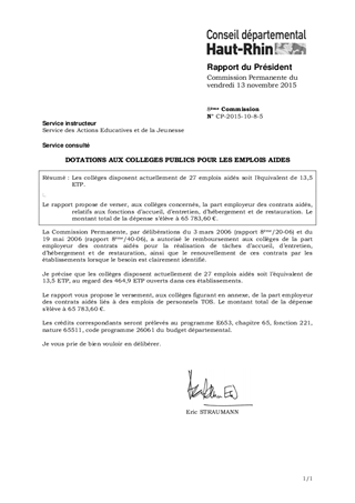 Les collèges disposent actuellement de 27 emplois aidés soit l’équivalent de 13,5 ETP. Le rapport propose de verser, aux collèges concernés, la part employeur des contrats aidés, relatifs aux fonctions d’accueil, d’entretien, d’hébergement et de restauration. Le montant total de la dépense s’élève à 65 783,60 €.
