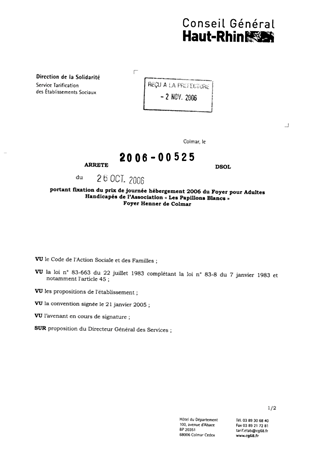 portant fixation du prix de journée hébergement 2006 du foyer pour adultes handicapés de l'Association "Les Papillons Blancs" - Foyer Henner de COLMAR. Resumé Pièces jointes ARRETE Assemblée : Non défini Date : 26/10/2006 Rapporteur : Non défini Collectivité : Conseil départemental du Haut-Rhin Direction : Non défini Service : Service de la Tarification des Etablissements Domaine : Prix de Journée Commission :
