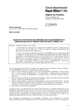 le présent rapport a pour objet : - de présenter les résultats de la campagne de tarification 2015 se traduisant par une économie de 2,9 M€, soit -2 %, par rapport à l’objectif d’évolution des dépenses pour cette même année 2015, - de fixer, en matière de dépenses relatives aux ESSMS et pour la part impactant le budget de la Collectivité, des enveloppes départementales de crédits limitatifs, opposables aux établissements pour la tarification 2016. Ces enveloppes s’élèvent globalement, sur la base d’un taux de reconduction de + 0,5% et de la mise en œuvre d’une convergence tarifaire, à 148 305 702 €, en progression de + 1,5 % par rapport aux budgets notifiés en 2015, mais en diminution de - 0,25% par rapport aux crédits inscrits au budget départemental 2015.