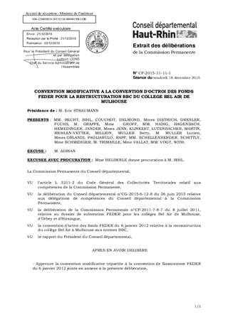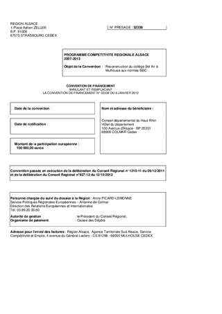 CONVENTION MODIFICATIVE A LA CONVENTION D'OCTROI DES FONDS FEDER POUR LA RESTRUCTURATION BBC DU COLLEGE BEL AIR DE MULHOUSE