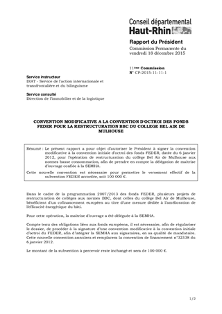 Le présent rapport a pour objet d’autoriser le Président à signer la convention modificative à la convention initiale d’octroi des fonds FEDER, datée du 6 janvier 2012, pour l’opération de restructuration du collège Bel Air de Mulhouse aux normes basse consommation, afin de prendre en compte la délégation de maîtrise d’ouvrage confiée à la SEMHA. Cette nouvelle convention est nécessaire pour permettre le versement effectif de la subvention FEDER accordée, soit 100 000 €.