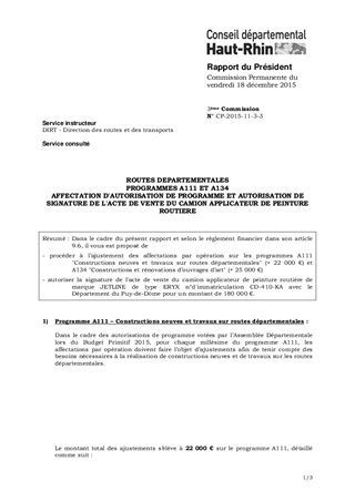 Dans le cadre du présent rapport et selon le règlement financier dans son article 9.6, il vous est proposé de - procéder à l’ajustement des affectations par opération sur les programmes A111 "Constructions neuves et travaux sur routes départementales" (+ 22 000 €) et A134 "Constructions et rénovations d’ouvrages d’art" (+ 25 000 €) - autoriser la signature de l'acte de vente du camion applicateur de peinture routière de marque JETLINE de type ERYX n°d'immatriculation CD-410-KA avec le Département du Puy-de-Dôme pour un montant de 180 000 €.