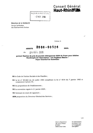 portant fixation du prix de journée hébergement 2006 du foyer pour adultes handicapés de l'Association "Les Papillons Blancs" foyer Graethof de GUEBWILLER. Resumé Pièces jointes ARRETE Assemblée : Non défini Date : 26/10/2006 Rapporteur : Non défini Collectivité : Conseil départemental du Haut-Rhin Direction : Non défini Service : Service de la Tarification des Etablissements Domaine : Prix de Journée Commission :