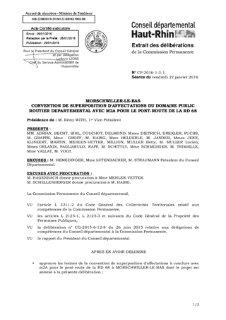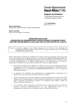 Le présent rapport a pour objet d'approuver les termes de la convention de superposition d'affectations à conclure avec m2A pour le pont-route de la RD 68, à MORSCHWILLER-LE-BAS.