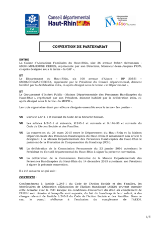 CONVENTION DE PARTENARIAT ENTRE LE DEPARTEMENT DU HAUT-RHIN, LA MAISON DEPARTEMENTALE DES PERSONNES HANDICAPEES (MDPH) DU HAUT-RHIN ET LA CAISSE D'ALLOCATIONS FAMILIALES DU HAUT-RHIN