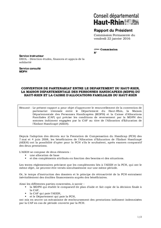 Le présent rapport a pour objet d’approuver le renouvellement de la convention de partenariat triennale entre le Département du Haut-Rhin, la Maison Départementale des Personnes Handicapées (MDPH) et la Caisse d’Allocations Familiales (CAF) qui précise les conditions de reversement par la MDPH des sommes indûment engagées par la CAF au titre de l’Allocation d’Education de l’Enfant Handicapé (AEEH).
