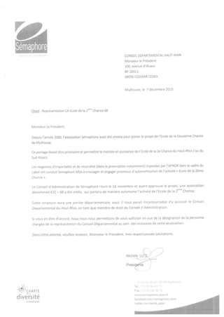 L’école de la seconde chance s’adresse aux 18/25 ans, pour faciliter leur insertion professionnelle, en leur permettant une mise à niveau des savoirs élémentaires et en facilitant par le biais de stages, une expérience en entreprise ou de formation. L’E2C de Mulhouse change de structure support (E2C – 68) afin de répondre à des normes imposées, entraînant l’opportunité d’une adhésion du Département et d'une désignation d’un représentant pour siéger au sein de cette structure. Il est proposé d'y donner une suite favorable et de désigner Monsieur Alain COUCHOT, élu du canton Mulhouse 1, référent sur la thématique de la Maison des Adolescents.