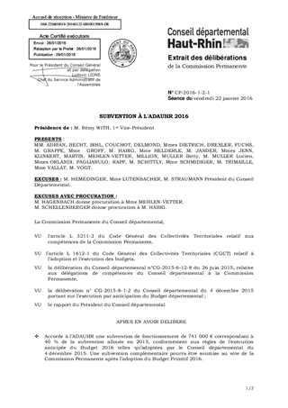 Le Conseil départemental ayant souhaité reporter le vote du Budget Primitif au mois de février 2016, le présent rapport a pour objet d'autoriser le versement anticipé de la subvention de fonctionnement attribuée à l'ADAUHR à hauteur de 741 000 € soit 40% de l'aide allouée en 2015.