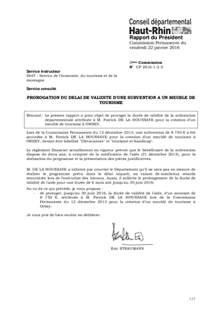 Le présent rapport a pour objet de proroger la durée de validité de la subvention départementale attribuée à M. Patrick DE LA HOUSSAYE pour la création d'un meublé de tourisme à ORBEY.